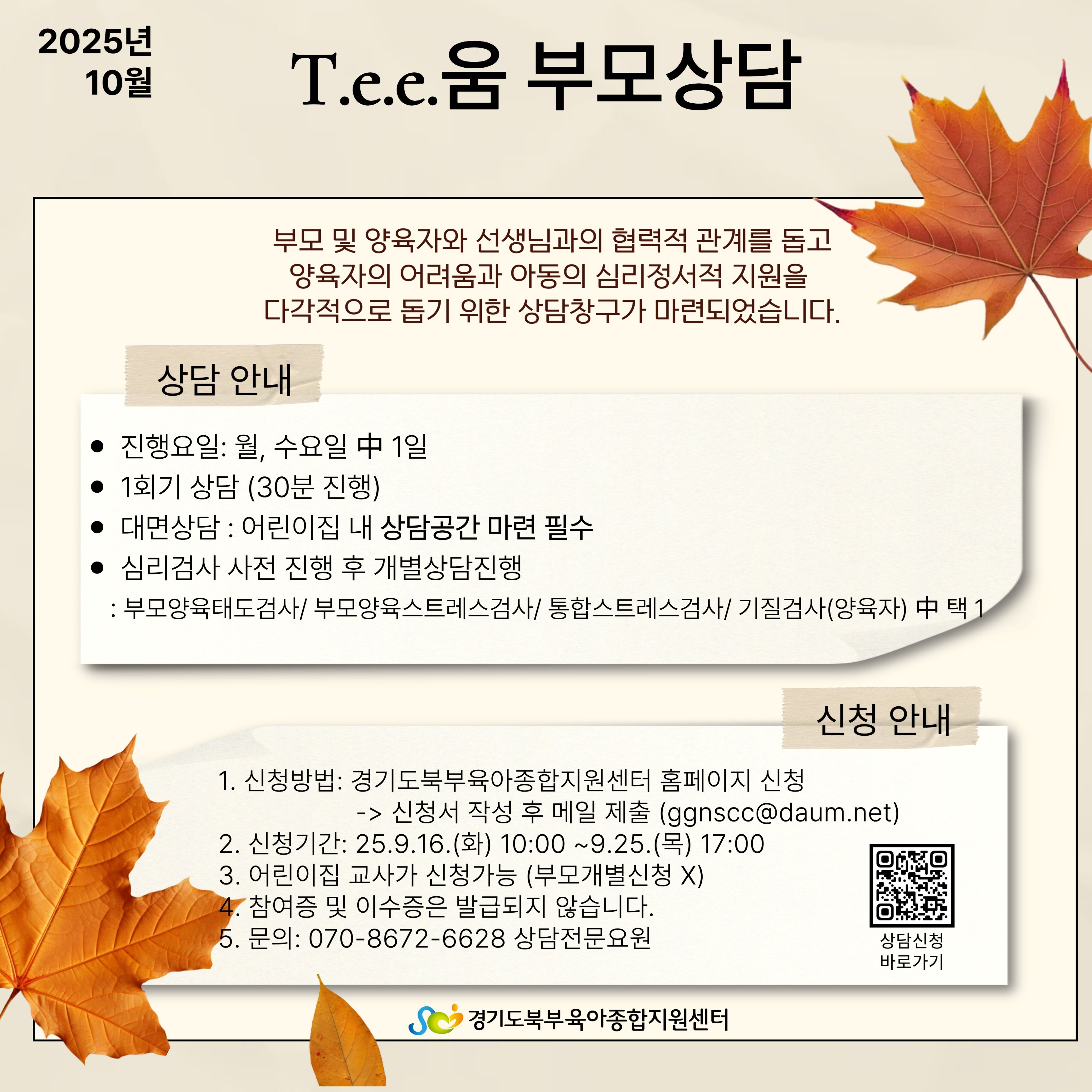 - 원아 문제 행동, 양육 스트레스, 개인의 고민도 상담하실 수 있습니다.