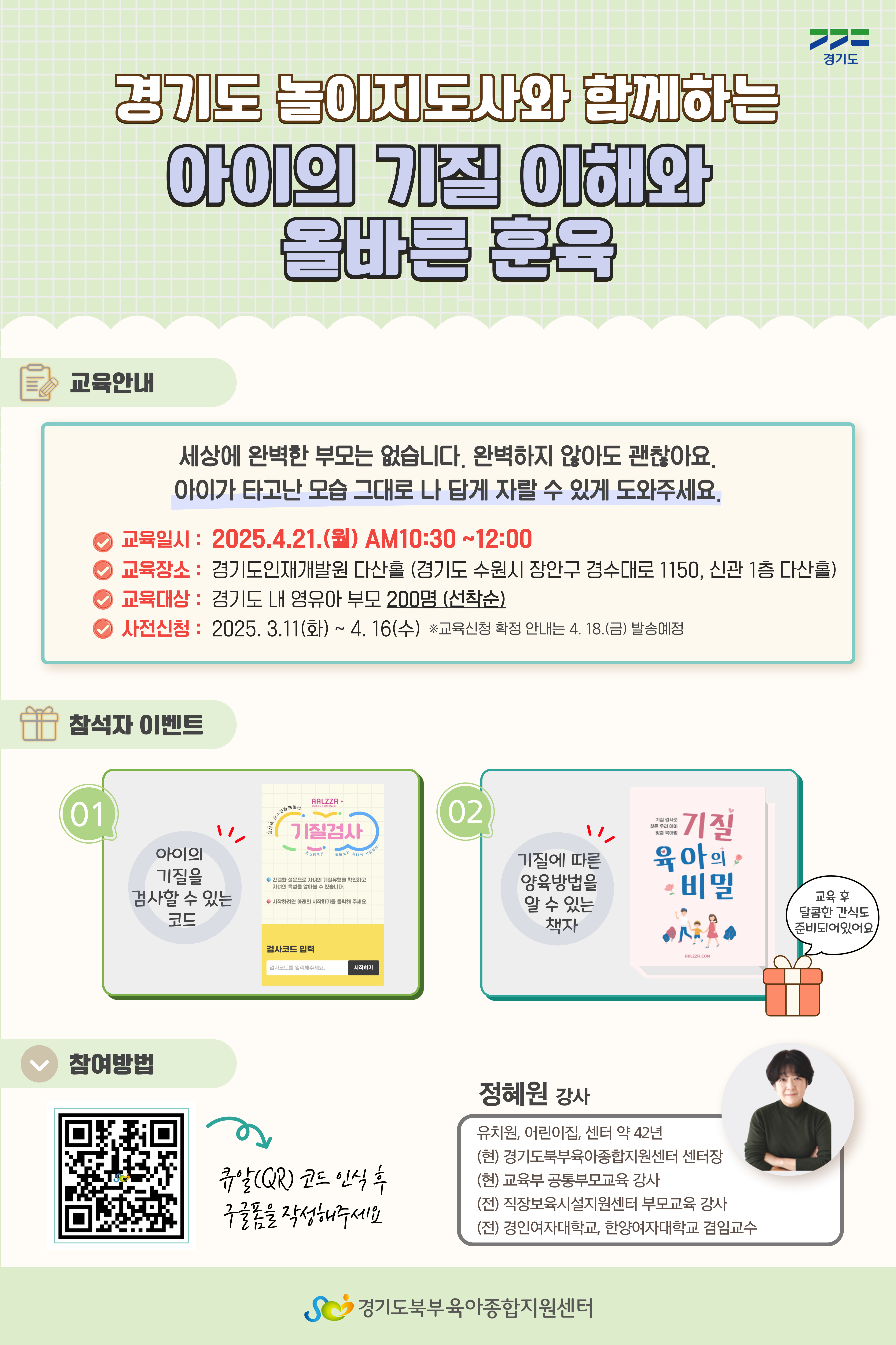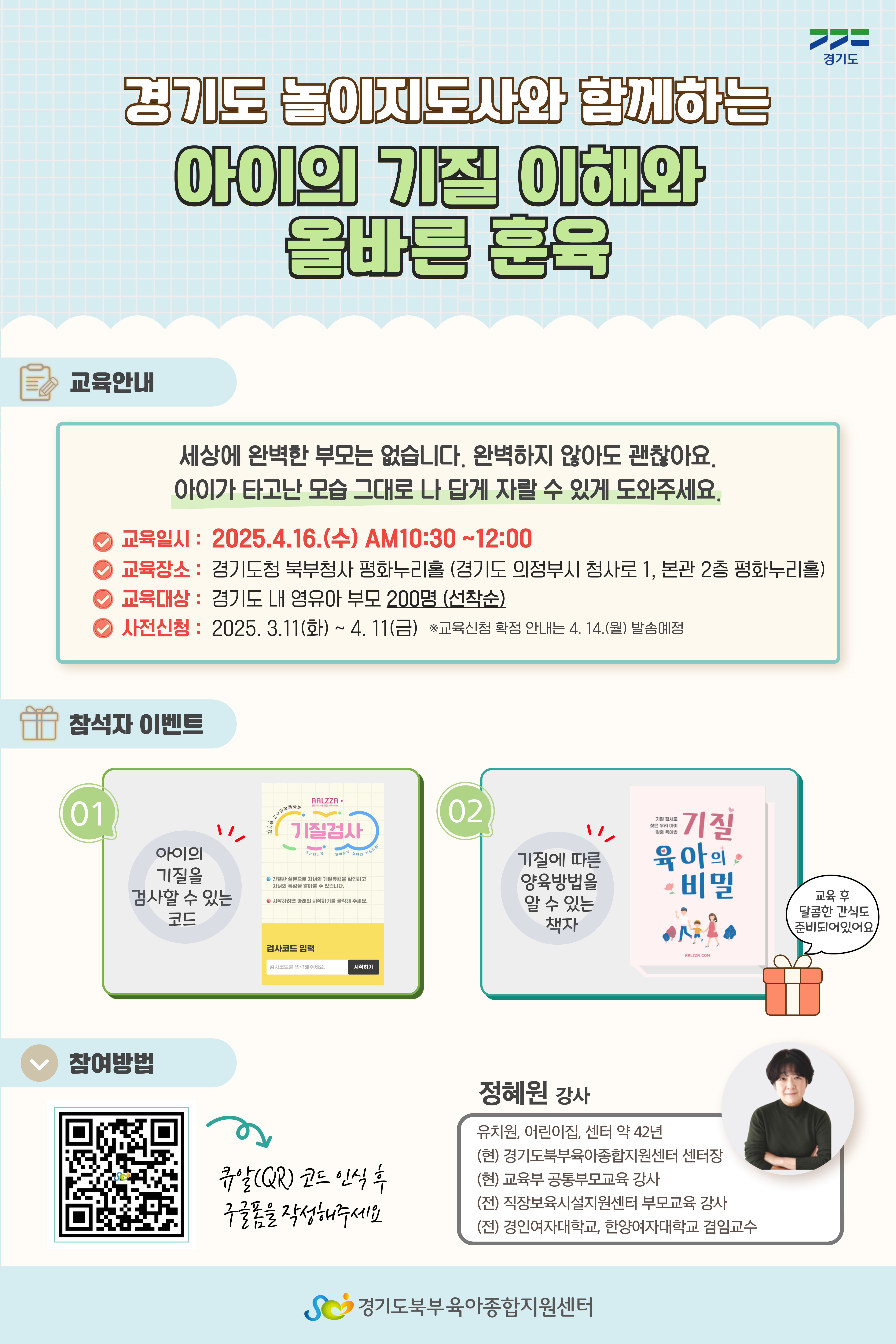 선착순 200명 마감되었습니다. ----------------------------- 경기도놀이지도사와 함께하는 「아이의 기질 이해와 올바른 훈육」부모교육을 경기도 북부지역에서 1회, 남부지역에서 1회 대면으로 진행합니다. ★주의사항 선착순으로 접수를 받으니, 관심있는 분들은 구글폼을 통해 2025. 3. 11.(화) 10:00부터 신청해주시기 바랍니다. 신청하실 때 꼭 희망하시는 교육장소 확인하시고 신청하시기 바랍니다! 경기도청 북부청사 본관 2층 평화누리홀 : https://forms.gle/ecHgi8YvDbraG9Zr5 경기도인재개발원 신관 1층 다산홀 : https://forms.gle/WBQcDkSfgxRbYvX78 교육 장소 내에서는 음식물 섭취가 불가합니다. 또한, 일회용품 규제로 테이크아웃 음료 등도 반입이 제한됨을 양해부탁드립니다. ★주차안내 많은 인원이 한번에 모이는 만큼, 주차장 이용이 원활하지 않습니다. 가급적 대중교통 이용 부탁드립니다! 교육 참여자에 대한 주차비 지원은 별도로 없습니다. 경기도청 북부청사 본관 2층 평화누리홀 : 신곡동 제1공영주차장(유료) 경기도인재개발원 신관 1층 다산홀 : 경기도인재개발원(무료) 내 주차 가능하나, 혼잡시 주변 공영주차장(유료) 이용 요망 문의 : 경기도놀이지도사(031-876-5767 내선0)