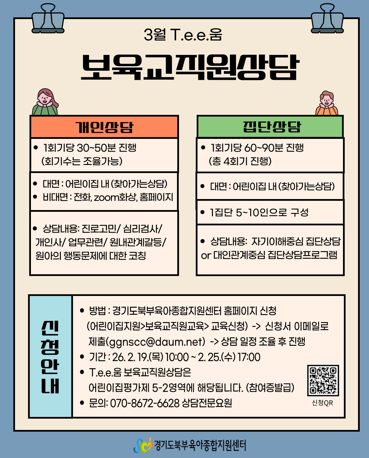안녕하세요. 경기도북부육아종합지원센터입니다. "26년 3월 티움 보육교직원 상담" 신청 안내 드립니다. <보육교직원 개인상담> - 보육교직원을 대상으로, 대면(원으로 찾아가는 상담)과 비대면(전화, 화상, 홈페이지) 중 택하셔서 상담을 진행합니다. - 업무관련 뿐 아니라 개인의 고민, 원아의 문제행동수정상담도 상담하실 수 있습니다. - 통합스트레스검사, 성격강점검사, 기질검사등 심리 검사도 진행합니다. - 1회기당 30~50분 진행합니다. (회기수는 조율이 가능합니다) * 보육교직원 개인상담과 집단상담은 어린이집 평가제 5-2영역에 해당됩니다.(이수증 발급) * 교사가 개별로 신청 가능하오니, 선생님들께도 많은 홍보 부탁드립니다. (개별아이디로 경기북부육아종합지원센터 홈페이지에서 신청가능) * 신청 방법: 경기도북부육아종합지원센터 홈페이지 신청(어린이집지원->보육교직원교육-> 교육신청) 후 신청서(붙임서류)를 작성하여 메일발송 (ggnscc@daum.net) * 신청기간: 2/19(목) 10:00~ 2/25(수) 17:00 *문의: 070-8672-6628 상담전문요원 김지애 *많은 신청 부탁드립니다. 감사합니다.